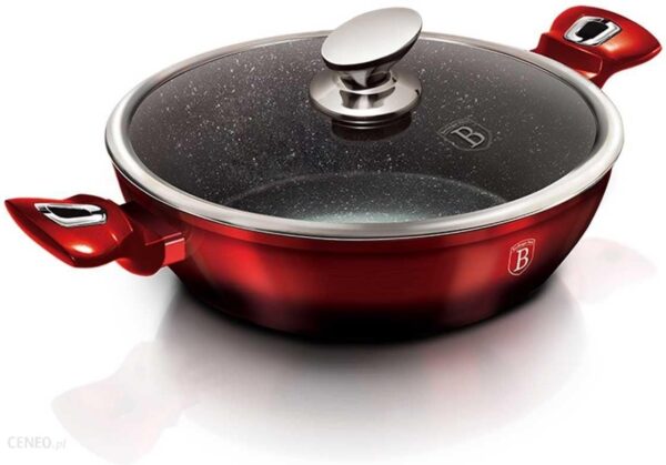 Garnki i akcesoria z serii METALLIC firmy BERLINGER HAUS wykonane są z wysokiej klasy kutego aluminium pokrytego wewnątrz potrójną powłoką granitową (marble) o bardzo wysokim współczynniku twardości. Powłoka zewnętrzna występuje w kilku wersjach kolorystycznych o charakterystycznym metalicznym połysku. Te atrakcyjne i modne naczynia wyposażone są standardowo w uchwyty typu SOFT TOUCH (silikon handle). Przystosowane do wszystkich rodzajów kuchenek: gazowa, elektryczna, ceramiczna, halogenowa, indukcyjna. System TURBO INDUCTION (bardzo szybko nagrzewają się) pozwala zaoszczędzić nawet 35% energii.Wymiary:Rozmiar Ø28 x 7,5cm – 3,8LSzklana pokrywa z odpowietrznikiem w zestawieCechy:Potrójna powłoka granitowa anty-przywierającaMateriał: wysokiej jakości odlewane aluminiumSoft-Touch Handle: silikonowe uchwytySystem TURBO INDUCTION (bardzo szybko nagrzewają się) 35% oszczędność enegriiMożliwość mycia w zmywarceDo wszystkich rodzajów kuchenek: gazowej, elektrycznej, ceramicznej, halogenowej, indukcyjnejKolor: CZERWONY ( BLACK BURGUND)Powłoka granitowa jest to powłoka teflonowa wzbogacona miałem granitowym, dzięki czemu uzyskuje większą twardość. Jest twardsza niż teflon, ale przy tym zachowuje jego zalety: nie przypala, dobrze rozprowadza ciepło. Łączy zalety naczyń żeliwnych i teflonowych. Ma wszelkie zalety teflonu, ale jest bardziej odporna na uszkodzenia, przewyższana w tym nawet powłoki ceramiczne.Granitowa powłoka sprawia, że naczynia są wyjątkowo odporne na wszelkie zarysowania i trwałe. Ten typ garnków i patelni pozwala również na smażenie przy użyciu minimalnej ilości tłuszczu, ponieważ naczynie rozgrzewa się podobnie do kamienia i oddaje ciepło całą swą powierzchnią.Kompozycja aluminiowego korpusu i ferromagnetycznego dna umożliwia użytkowanie na kuchni indukcyjnej oraz na wszystkich innych rodzajach kuchni i wykorzystywania najlepszych właściwości akutermicznych odlewanego i kutego aluminium na wszystkich kuchenkach i płytach grzewczych. .