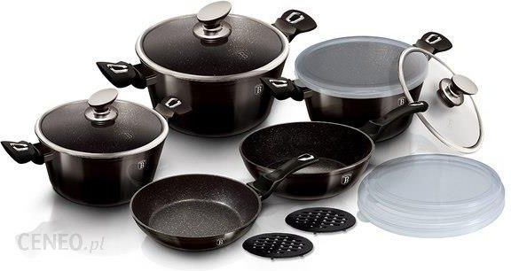 Zawartość:Patelnia 28 x 5,2 cm, 2.4 LGłęboka patelnia 24 x 6,5 cm, 2.3 LGarnek ze szklaną pokrywką 20 x 10.4 cm, 2.5 LGarnek ze szklaną pokrywką 24 x 11.8 cm, 4.1 LGarnek ze szklaną pokrywką 28 x 12,4 cm, 6.1 LBakelitowe podkładki 2 sztPokrywki z tworzywa sztucznegoMateriał:NylonWysokiej jakości kute aluminiumPotrójna warstwa powłoki marmurowejPokrywki ze szkła hartowanegoKolor: CzarnyCechy:Przybory kuchenne:Ergonomiczne miękkie uchwytyNie przenoszą zapachów żywnościNie rysują powłoki naczyniaPrzydatne w każdej kuchniZestaw garnków:Elegancki designStylowy i funkcjonalnyŁatwy w utrzymaniu czystościMożna myć w zmywarce35% oszczędność energiiPokrywki pasują na patelnieMożna smażyć na minimalnej ilości tłuszczuSystem TURBO INDUCTION (bardzo szybko nagrzewają sięEco Friendly – nie zawiera związków PFOA, ołowiu, kadmuDo wszystkich rodzajów kuchenek: gazowa, elektryczna, ceramiczna, halogenowa, indukcyjna