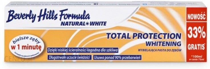 BEVERLY HILLS NATURAL WHITE to seria past do zębów o działaniu wybielająco-ochronnym. Pasty BEVERLY HILLS NATURAL WHITE skutecznie usuwają przebarwienia, a dzięki niskiemu współczynnikowi ścierania, nie są abrazyjne dla szkliwa jak większość pasty wybielających.BEVERLY HILLS NATURAL WHITE Total Protection Whitening skutecznie usuwa przebarwienia z powierzchni szkliwa a dzięki niskiej ścieralności jest łagodna dla szkliwa i dziąseł. Jedna z niewielu past wybielających, która może być stosowana przed osoby z nadwrażliwością zębową i delikatnymi dziąsłami.Właściwości pasty BEVERLY HILLS NATURAL WHITE Total Protection Whitening:- badania laboratoryjne przeprowadzone na brytyjskiej Uczelni Stomatologicznej udowodniły, że dzięki zaawansowanej recepturze pasta usuwa przebarwienia w ciągu 1 minuty. Pomaga w widoczny sposób przywrócić zębom naturalną biel i blask,- niski współczynnik ścieralności – pasta nie jest abrazyjna dla szkliwa i dziąseł, przez cos może być bezpiecznie stosowana przez osoby z nadwrażliwością zębową,- ksylitol + triclosan – dzięki połączeniu tych dwóch składników pasta skutecznie zapobiega powstawaniu płytki nazębnej, która osadza się na zębach powodując próchnicę, wywołując stany zapalne dziąseł, nieświeży oddech a zalegająca krystalizuje się w kamień nazębny.- wapń + fluor – oba składniki wykazują działanie remineralizujące szkliwa. Wzmocnione szkliwo jest bardziej odporne na działanie bakterii i pojawienie się próchnicy. Zremineralizowane szkliwo to także większa odporność na działanie kwasów czy pojawienie się nadwrażliwości zębowej.- trwały miętowy smak zapewnia długotrwałe uczucie świeżości.Pasta BEVERLY HILLS NATURAL WHITE Total Protection Whitening usuwa ponad 90% przebarwień już w pierwszej minucie szczotkowania zębów.Pasta zawiera Monofluorophosphate 0,76% (1000ppm).Stosowanie: Pasta BEVERLY HILLS NATURAL WHITE Total Protection Whitening przeznaczona jest do stosowania codziennego, 2-3 razy dziennie. Należy szczotkować zęby przez zalecany czas 2 minut. Dla wzmocnienia efektu usuwania przebarwień z powierzchni szkliwa należy pozostawić pastę na zębach przez 1 minutę przed szczotkowaniem. Nie należy połykać pasty. Dzieci poniżej 6 roku życia powinny stosować pastę w ilości ziarna grochu, aby zminimalizować ryzyko połknięcia.Skład: Aqua, Sorbitol, Hydrated Silica, Xylitol, Glycerin, Pentasodium Triphosphate, Sodium Bicarbonate, Sodium Lauryl Sulfate, PEG-32, Aroma, Cellulose Gum, Sodium Monofluorophosphate, Sodium Saccharin, Triclosan, Lacium Glycerophosphate, Limonine, Cl77891.