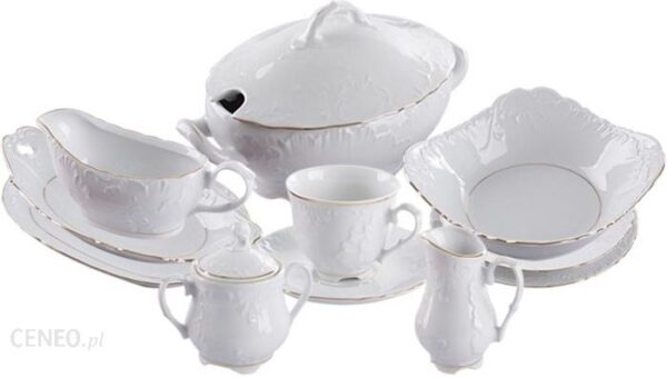 OPIS PRODUKTU:ĆMIELÓW ROCOCO – 84 częściowy, porcelanowy serwis obiadowy w kolorze białym ze złotym zdobieniem na 12 osóbKomplet obiadowy składa się z:- 12 sztuk – talerz obiadowy – średnica 25 cm- 12 sztuk – talerz głęboki do zupy – średnica 22,5 cm- 12 sztuk – talerz deserowy – średnica 19 cm- 1 sztuka – półmisek owalny – 29 cm- 1 sztuka – półmisek owalny – 33 cm- 1 sztuka – rawier 25 cm- 1 sztuka – sosjerka 0,45 litra- 2 sztuki – salaterka kwadratowa 17 cm- 1 sztuka – salaterka kwadratowa 24 cm- 1 sztuka – salaterka kwadratowa 27 cm- 1 sztuka – waza do zupy 2,7 litraKomplet kawowy składa się z:- 12 sztuk – filiżanka – wysokość 7,5 cm, średnica 9 cm, poj. 250 ml- 12 sztuk – spodek – średnica 15, 5 cm- 12 sztuk – talerz deserowy 17 cm- 1 sztuka – imbryk do kawy – wysokość 25 cm, poj. 1,1 litra- 1 sztuka – dzbanuszek na śmietankę – wysokość 12,5 cm, poj. 250 ml- 1 sztuka – cukiernica – wysokość 13 cm, poj. 400 mlDodatkowe informacje:- nie zaleca sie mycia w zmywarce- całość pakowana w karton