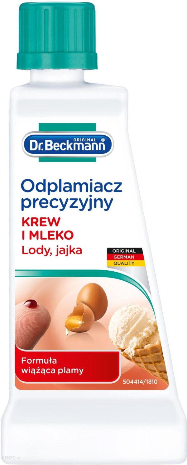 DR.BECKMANN Odplamiacz – Krew I Mleko 50ml Aktywna formuła Odplamiacza Precyzyjnego – Krew i mleko została stworzona na bazie enzymów, które wiążą plamy.Składniki plam z jaj, białka czy krwi są oddzielane od tkaniny, co pozwala na łatwe usunięcie plamy. Właściwości- Szybko wiąże plamę- Usuwa plamy z krwi, lodów, jaj, mleka, jogurtu, śmietany, a także plamy z ropy i nasienia- Może być stosowany na tkaninach nadających się do prania lub nie- Chroni kolory i tkaniny Idealny do usuwania plam z:krwi, skondensowanego mleka, jajka, likieru jajecznego, potraw jajecznych, lodów, ropy, jogurtu, mleka, puddingu, twarogu, śmietany, śliny, nasienia, skrobi.Nie stosować na dywanach wyrobach skórzanych tkaninach kaszmirowychSposób użycia:Tkaniny nadające się do prania.Obficie pokryj plamę Odplamiaczem Precyzyjnym.Pozostaw na 10-15 minut, aby produkt mógł zadziałać.Upierz tkaninę jak zwykle.Tkaniny nie nadające się do prania.Obficie pokryj plamę Odplamiaczem Precyzyjnym.Pozostaw na 10-15 minut, aby produkt mógł zadziałać.Zabrudzone miejsce dokładnie wytrzyj wilgotną ściereczką.Pomocne wskazówkiIm wcześniej zaczniesz usuwać plamę, tym łatwiej się jej pozbędziesz.Zawsze usuwaj plamy przed praniem.Pamiętaj, aby sprawdzić trwałość koloru i odporność materiału w niewidocznym miejscu.Stosuj się do zaleceń producenta na metce.Nie usuwaj plam na delikatnych powierzchniach. Zastosuj odpowiednią podkładkę, np. spodek lub czystą ściereczkę.