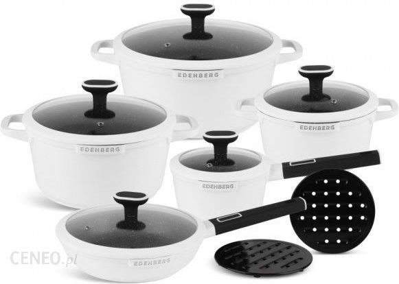 12-częściowy zestaw garnków z patelnią i akcesoriami EDENBERGZestaw zawiera:rondel z pokrywką o pojemności 1.4l i średnicy 16 cmgarnek z pokrywką o pojemności 2.6l i średnicy 20cmgarnek z pokrywką o pojemności 4.5l i średnicy 24cmgarnek z pokrywką o pojemności 6.7l i średnicy 28cmpatelnię z pokrywką o pojemności 1.9l i średnicy 24cmpodstawki pod garnek 2 szt.Dostosowane do kuchenek:gazowychceramicznychelektrycznychindukcyjnychMateriał: tłoczone aluminiumPowłoka: ceramiczno-marmurkowa, dodatkowo powleczona nieprzywieralną powłoką non-stick, wolna od szkodliwych substancji PFOALekka obudowa zapewnia znakomitą przewodność ciepłaWysoka odporność na zarysowania i temperaturęWygodny uchwyt z miękką powłokąObręcz sylikonowa pokrywki, łatwa do czyszczenia.Pokrywki wykonane z hartowanego szkła z otworem na paręKolor: biały/czarny nakrapianyPrzystosowane do wszystkich rodzajów kuchenek w tym indukcyjnych …