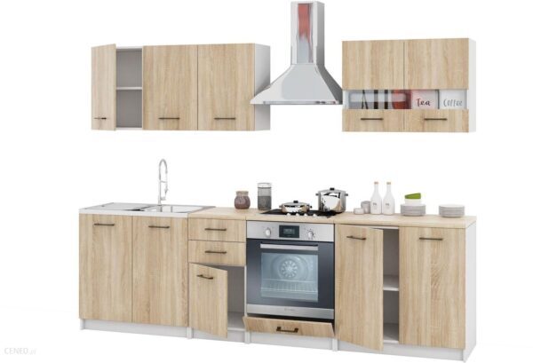 ZESTAW MEBLI SFERIA 01P DĄB SONOMA to wysokiej jakości komplet mebli kuchennych utrzymany w kolorze naturalnego drewna. Zestaw zawiera blat, cokół oraz uchwyty dwupunktowe. Połączenie elementów pozwala na stworzenie funkcjonalnej i spójnej kolorystycznie kuchni. ZESTAW MEBLI SFERIA 01P DĄB SONOMA został wykonany z płyty laminowanej. Dzięki temu materiałowi elementy wchodzące w zestaw są odporne na tłuste opary, wysoką temperaturę, zadrapania, uderzenia oraz ścieranie. Mogą być czyszczone zwilżoną ściereczką lub preparatami chemii domowej do czyszczenia mebli z laminatów. ZESTAW MEBLI SFERIA 01P DĄB SONOMA jest przeznaczony do samodzielnego montażu.