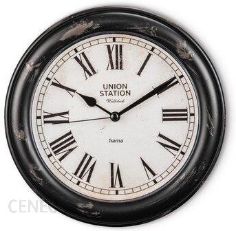 Zegar kwarcowy z analogowym wyświetlaczem czasu w stylu zegara dworcowego retro. Biała tarcza z czarnymi cyframi rzymskimi. Cichy mechanizm zegarowy z pełzającym sekundnikiem. wskazówki godzinowe, minutowe i sekundowe. Dekoracyjny zegar ścienny o stylowym wzornictwie vintage.
