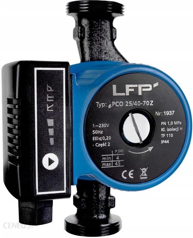 Lfp Leszno Epco Pompa Elektroniczna 25/40-70 (epco 25/4-7)POMPA OBIEGOWA MODEL 25-40-70/180 Rozstaw montażowy 180mm. Dane Techniczne:-Jedna pompa dwie wysokości podnoszeniaJeden model pompy ePCO 25/40-70 zastępuje jednocześnie w parametrach Q (wydajność) i H (wysokość podnoszenia) dwa typy pomp 25/40 i 25/60. Jak to możliwe? Jedna pompa dwie charakterystyki. Dzieje się tak za pośrednictwem jedno-sekwencyjnego przycisku umieszczonego na panelu sterującym silnika pompy. Pozwala on na wybranie odpowiedniej charakterystyki stałej lub proporcjonalnej z wysokością podnoszenia 4, 5 lub 6m. -wydajność: do 3,3m3/h-wysokość podnoszenia max.: do 4,5 lub 6 metrów-temperatura czynnika: od 5 do 110C-średnica przyłączy: 1 CAL (na klasyczny śrubunek do pomp)-napięcie zasilające: 1~230/240V-pobór mocy pompy: 6-44 W-regulacja prędkości: ręczna lub samoregulująca się prędkość obrotowa (6-44W)-Gwarancja Producenta-uszczelki gratis