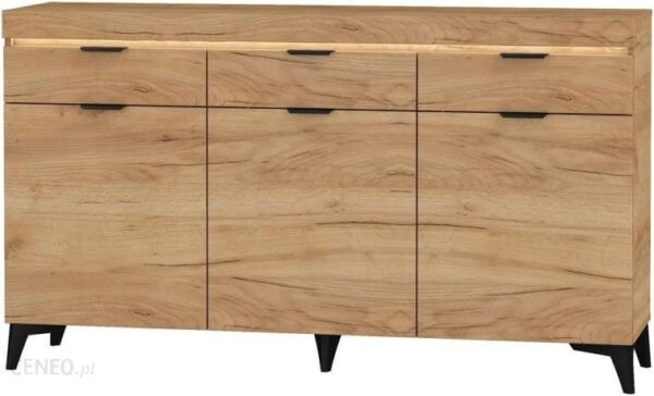 Meble systemu Bragi zostały wykonane z wysokiej jakości płyty laminowanej w modnym i ciepłym kolorze dąb złoty craft, który z opcjonalnym oświetleniem wieńca tworzy miłą i ciekawą kolekcje do każdego salonu. Charakteru nadają tu niebanalne czarne nogi oraz delikatne uchwyty również w czarnym kolorze. Dla większej wygody użytkowania zawiasy we frontach zostały wyposażone w funkcje cichego domyku oraz zastosowano wysokiej jakości prowadnice z funkcją pełnego wysuwu.Komoda BGK-1 posiada trzy pojemne szuflady pod blatem na prowadnicach z pełnym wysuwem oraz pod nimi trzy fronty za którymi znajdziemy półki. Do mebla istnieje możliwość dokupienia oświetlenia LED-NEO-8c montowanego w wieńcu górnym. Dla większej wygody użytkowania fronty zostały wyposażone w zawiasy z mechanizmem cichego domyku.Wymiary Komody Bargi(szerokość/wysokość/głębokość):(S/W/G): 157/90/39,9 cmDODATKOWE INFORMACJE:Meble wykonane są z wysokiej jakości płyty wiórowej laminowanej odpornej na zarysowania, z obrzeżami typu ABS.Meble dostarczane są w paczkach do samodzielnego montażu, wraz z instrukcją oraz okuciami.