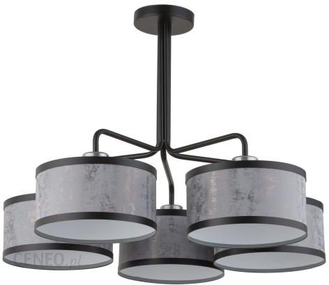 Lampa wisząca 5 punktowa z abażurami w kolorze szaro-srebrnym. Elementy metalowe wykończone w kolorze czarnym ze srebrnymi wstawkami.