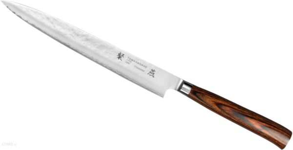 Tamahagane Tsubame Brown VG-5 Nóż Sashimi 24 cm Dane techniczne:Ostrze – rdzeń VG-5 okuty stalą nierdzewną SUS410Rękojeść – brązowa micartaTwardość – 61 HRC +/- 1Długość całkowita – 38,9 cmDługość ostrza – 24,0 cmSzerokość klingi – 3,1 cmGrubość klingi – 2,8 mmSposób ostrzenia – Waga – ok. 184 g