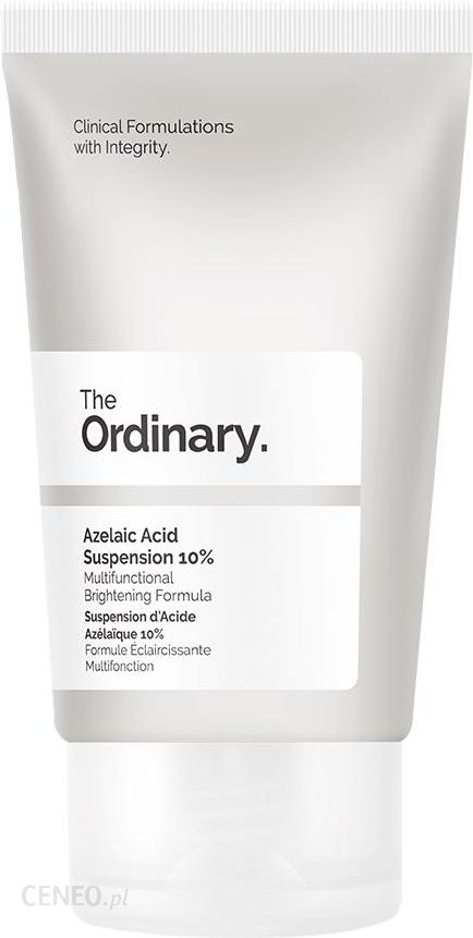 THE ORDINARY AZELAIC ACID SUSPENSION 10% Kwas azelainowyKwas azelainowy jest wielofunkcyjnym składnikiem, który jest przeznaczony do wszystkich rodzajów skóry. Doskonale sprawdzi się do zmniejszenia przebarwień. Ph kosmetyku waha się pomiędzy 4.0 i 5.0.Cechy i właściwości kwasu azelainowego The Ordinarymniejsza zaczerwienienie i trądzik różowaty,chroni skórę przed uszkodzeniem przez wolne rodniki,poprawia strukturę iPojemność: 30ml