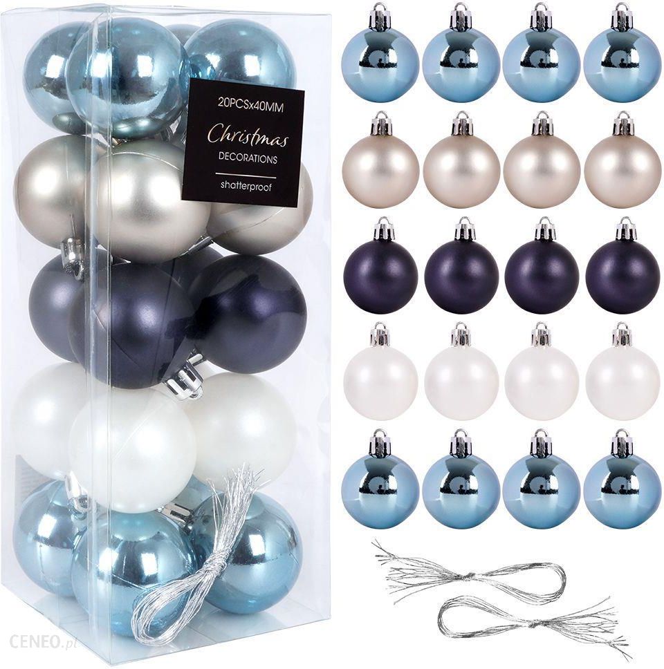 Zestaw 20 sztuk dekoracyjnych bombek na choinkę. Bombki są nietłukące, trwałe i bezpieczne. W zestawie bombki matowe i błyszczące w kolorze białym, srebrnym i niebieskim.