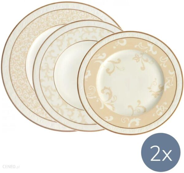 Kolekcja Ivoire to idealna prozozycja dla wielbicieli klasycznych kształtów i elegancji. Porcelana udekorowana delikatnymi wzorami w barwie kości słoniowej, wykończona złotą lamówką to synonim luksusu. Kwieciste reliefy podkreślają klasyczny kształt kolekcji i czynią ją ponadczasową. Naczynia z tej serii zostały wykonane z porcelany kostnej Premium, dzięki czemu posiadają wysoką odporność na uszkodzenia mechaniczne i nadają się do mycia w zmywarce. Nie nadają się do użytku w kuchence mikrofalowej. Porcelana kostna Premium to najwyższej jakości delikatna porcelana uważana za jedną z najcenniejszych. Jej produkcja to skomplikowany proces, w którym dzięki dodatkowi popiołu kostnego otrzymuje się nieporowatą i lśniącą, białą porcelanę. Ten składnik nadaje porcelanie szczególne właściwości estetyczne: – wysoki stopień bieli; – delikatny połysk; – niezwykłą przejrzystość, cieńkość i lekkość. W skład zestawu wchodzi: Talerz Ivoire 22cm śniadaniowy Okrągły talerz Ivoire marki Villeroy&Boch o średnicy 22cm sprawdzi się idealnie do serwowania śniadań, kolacji, a także przekąsek, przystawek czy deserów wymagającej odpowiedniego naczynia do prezentacji. Talerz Ivoire 24cm głęboki Głęboki talerz Ivoire marki Villeroy&Boch o średnicy 24cm sprawdzi się idealnie do serwowania zarówno tradycyjnych, jak i zup kremów oraz dań z makaronem oraz przystawek. Talerz Ivoire 27cm obiadowy Płaski talerz Ivoire marki Villeroy&Boch o średnicy 27cm sprawdzi się idealnie do serwowania dań obiadowych, a także wytwornych kolacji, przystawek czy jako elegancki podtalerz.